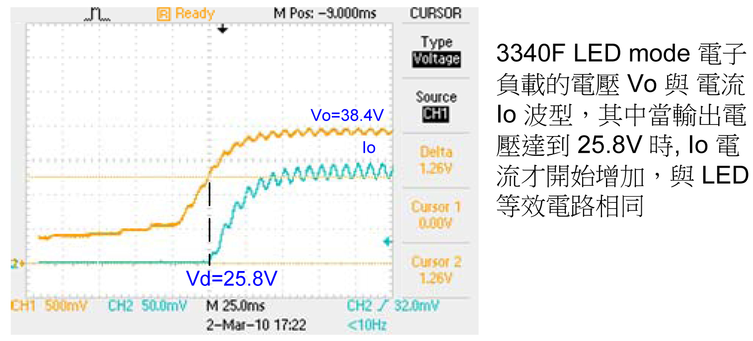 2.3 LED mode;LED 模式為模擬等效電路圖(2) 的LED,整合上述的CR mode + CV mode而成,3340F系列 LED mode 需設定 Vd 與 Rd,此時電流波形與 2.1 實際 LED 負載相同。