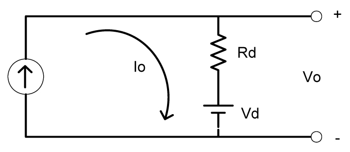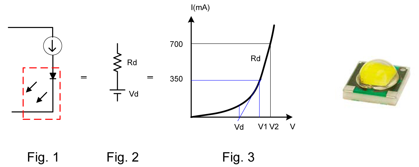 1.1 圖 1 LED 的等效電路為圖 2 的電阻 Rd 與串聯電壓 Vd,特性曲線如圖 3 所示,當 LED 兩端的電壓大於 LED 等效串聯電壓 Vd 後,流經 LED 的電流 Io 為(V-Vd)/Rd (即為等效電阻 Rd)。
