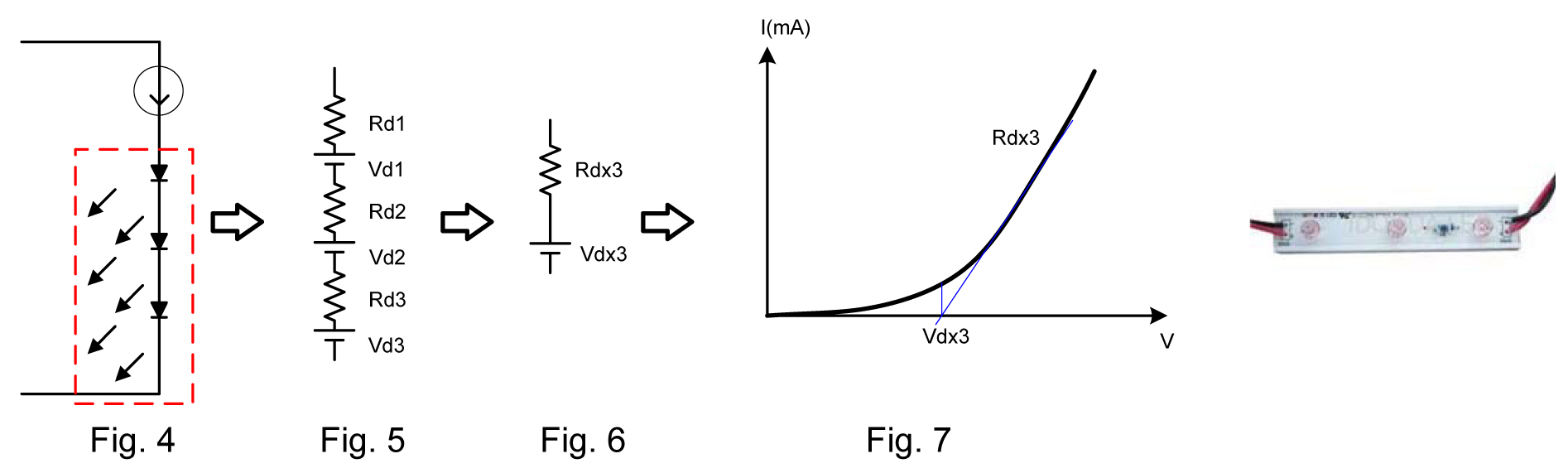 1.4 多個 LED 串聯,多個 LED 串聯可增加輸出亮度,Vd 及Rd 均會依串接的倍數增加。圖 4 為 3 個 LED 串聯,其等效電路如圖 5 所示,圖 6 為簡化的等效電路,圖 7 為對應的特性曲線。