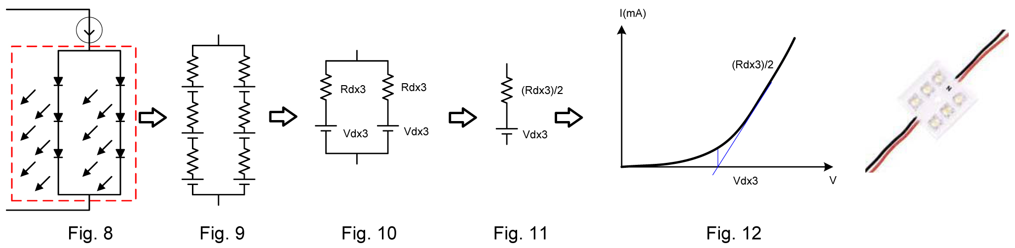1.5 多個 LED 串併聯:多個 LED 串併聯可更增加輸出亮度,Vd 會依串接的倍數增加,Rd 則依串併的結果,圖 8 為兩串各 3 個 LED 的併聯,其等效電路如圖 9 所示,簡化的等效電路如圖 10,最簡化的等效電路如圖 11,其特性曲線如圖 12 所示。
