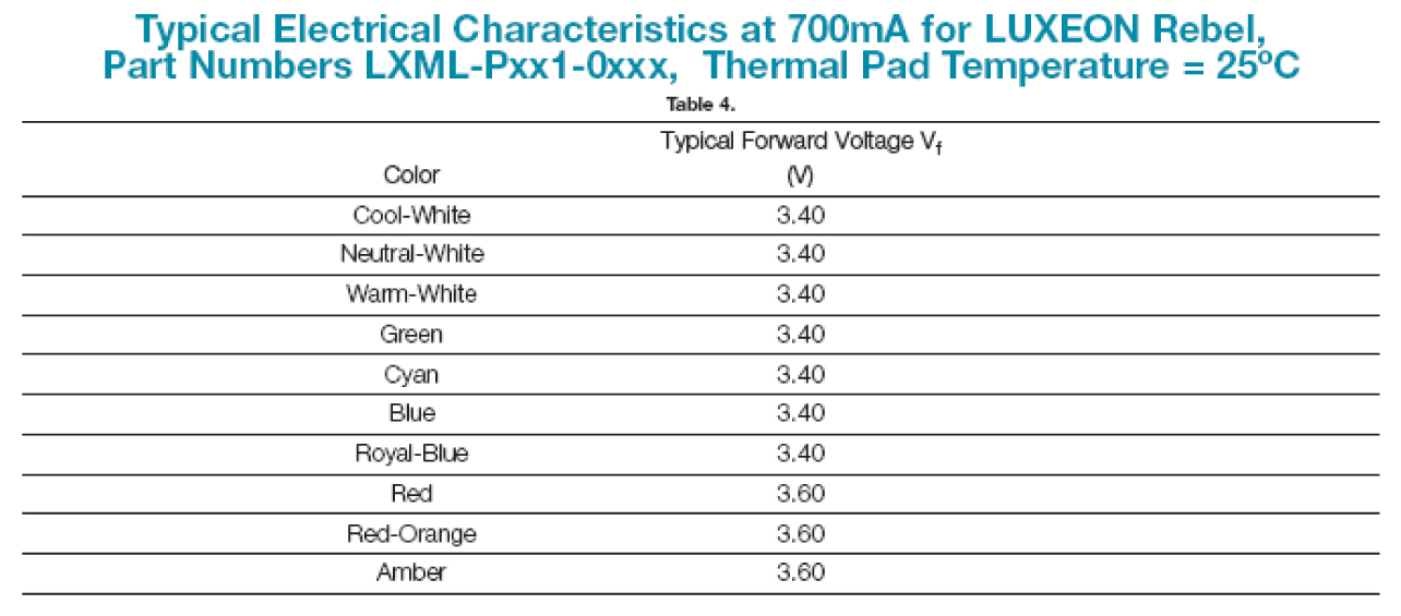 3.1.1 依 LED 規格表找出 Vo, 即上表的 Vf(Forward Voltage),一般 LED 廠商規格表上標示的Vf(Forward Voltage) 並非 LED 特性曲線中的順向偏壓電壓點,而是 LED 的輸出電壓點 Vo。