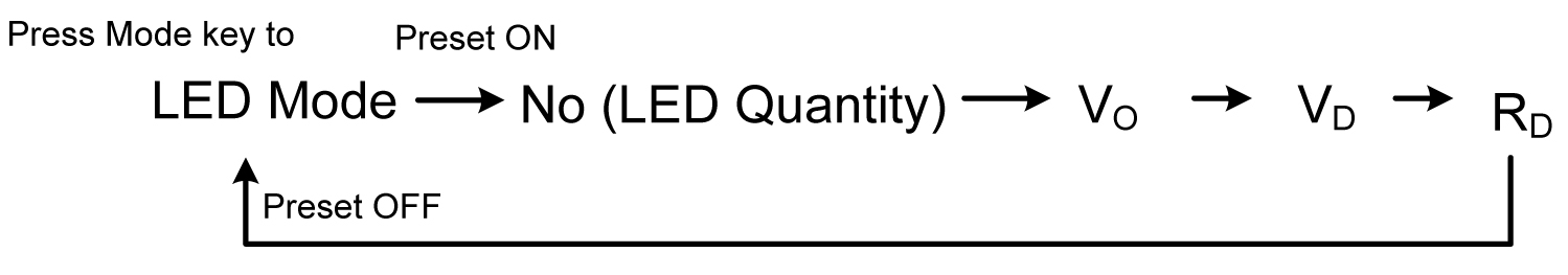 按下“PRES”鍵設定 LED 串聯或者串併聯數量(初始值為 1, 一般來說 LED Driver 輸出規格都已經直接列出 Vo最終數值,故一般來說設定在 1即可) 。